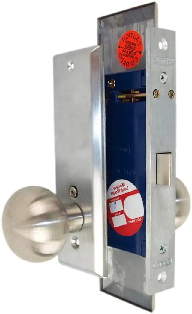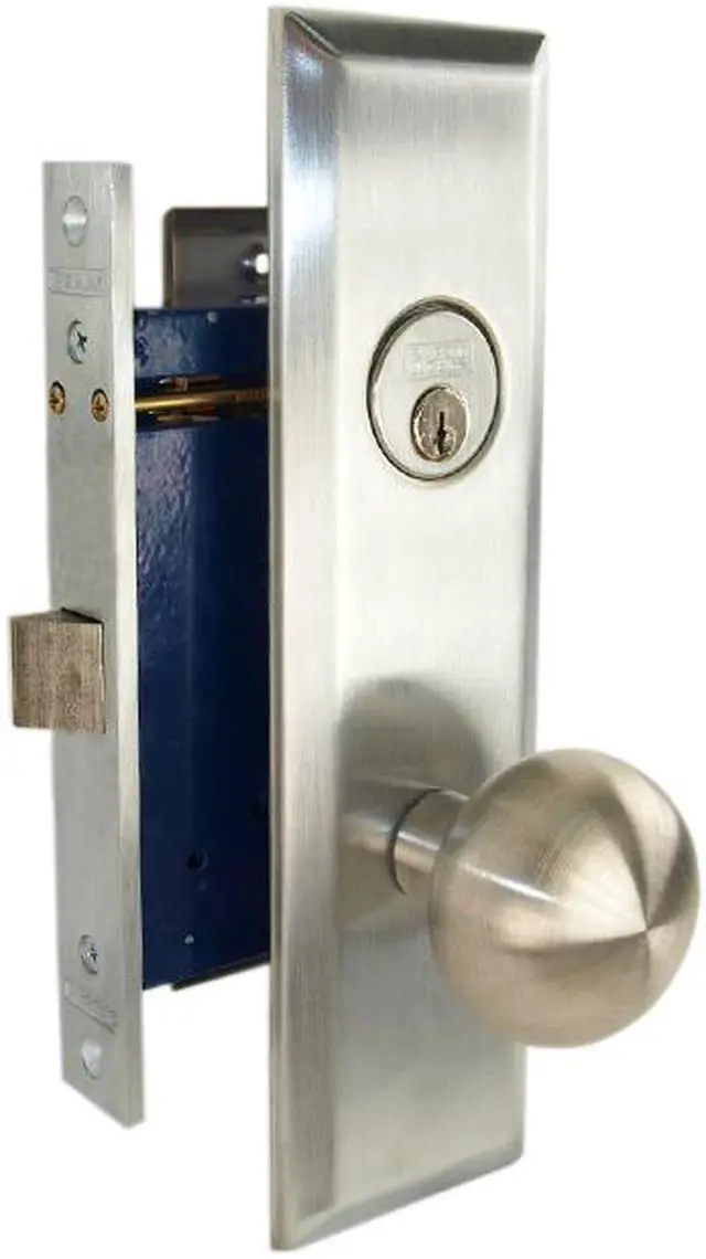 Marks New Yorker 9NY10DW/26D, Satin Chrome Right Hand Mortise Lock Knob Vestibule Function Always Locked Storeroom Lockset Screwless Knobs Thru Bolted Lock Set. 2-1/2 Backset, Latch Only (No Bolt and Rocker), Front face plate:1-1/16" x 7-5/8". Cylinder on outside and NO thumb turn on inside. Commercial Mortise Locksets.