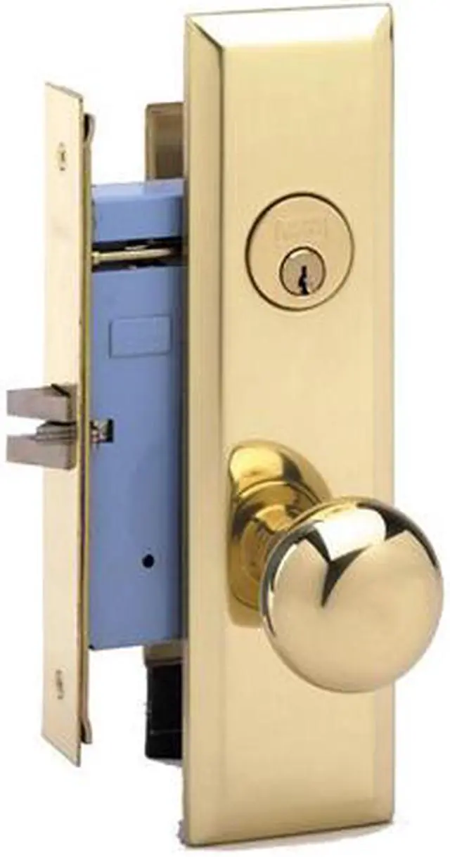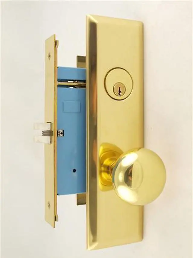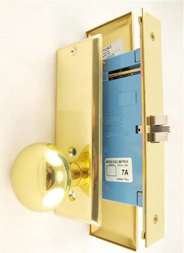 Marks New Yorker 7NY10DW/3, Polished Brass Right Hand Mortise Lock Knob Vestibule Function Always Locked Storeroom Lockset. 2-3/4" Backset, Latch Only (No Bolt and Rocker), Wide Front face plate:1-1/4" x 8", Latch: Scissor Latch and Anti Friction Latch. Cylinder on outside and NO thumb turn on inside. Thru-bolted screwless knob plate assemblies Lock Set. Commercial Mortise Locksets.