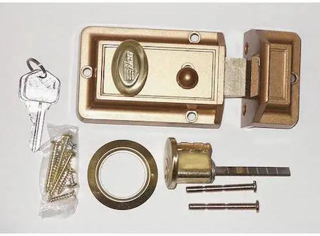 Rim Lock, Night Latch, Brass-Plated Finish, Material Zinc Chromated Heavy Gauge Steel, For Door Thickness 1-3/8 in to 2-1/4 in, Backset 2 3/8 in, Single Cylinder, Keying Keyed Different, Keyway Type KW1, Pins 5, Throw Length 3/4 in, Number of Keys 2. This item has been restricted from sale in the following state (s): []