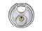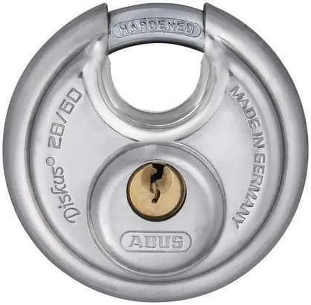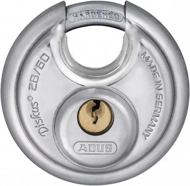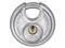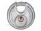 Padlock, Shackle Dia. 5/16 in, Shackle Height 1/2 in, Shackle Width 11/16 in, Shackle Material Steel, Body Height 2 23/64 in, Body Width 2 23/64 in, Body Thickness 1 1/32 in, Body Material Stainless Steel, Number of Bumpers 0, Number of Pins 4 Pin, Key Type Different, For Use With Hasps, Storage Units, or Chains, Body Color Silver, Body Dia. 2 3/8 in, Weather Resistant Yes, High Security No, Interchangeable Core No, Padlock Body Shape Disc, Rekeyable No, Shackle Type Partially Hidden Shackle.