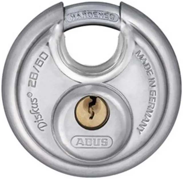 Padlock, Shackle Dia. 5/16 in, Shackle Height 1/2 in, Shackle Width 11/16 in, Shackle Material Steel, Body Height 2 23/64 in, Body Width 2 23/64 in, Body Thickness 1 1/32 in, Body Material Stainless Steel, Number of Bumpers 0, Number of Pins 4 Pin, Key Type Alike, Opens with Key No. 28, For Use With Hasps, Storage Units, or Chains, Body Color Silver, Body Dia. 2 3/8 in, Weather Resistant Yes, High Security No, Interchangeable Core No, Padlock Body Shape Disc, Rekeyable No.