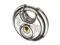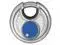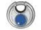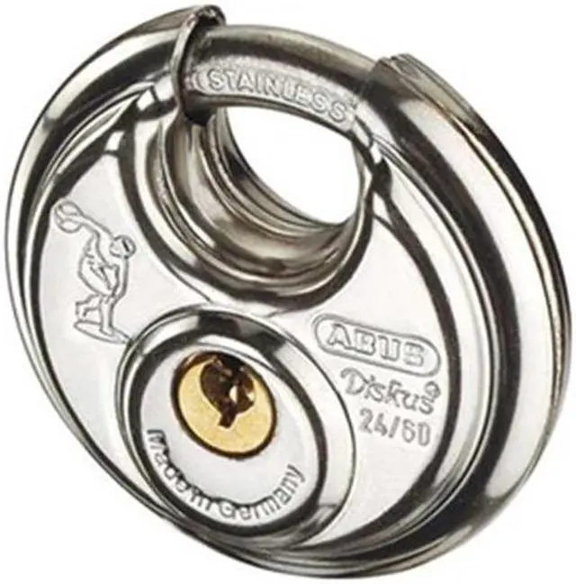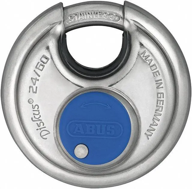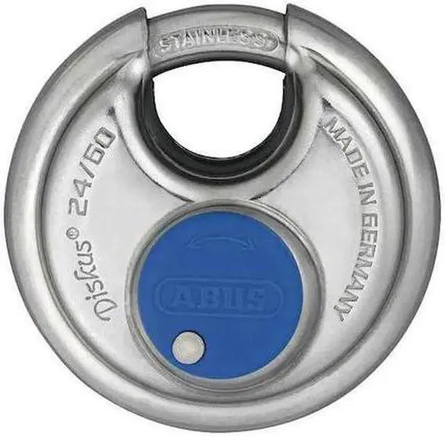 Padlock, Shackle Dia. 5/16 in, Shackle Height 1/2 in, Shackle Width 11/16 in, Shackle Material Stainless Steel, Body Height 2 23/64 in, Body Width 2 23/64 in, Body Thickness 1 1/16 in, Body Material Stainless Steel, Number of Bumpers 0, Number of Pins 4 Pin, Key Type Different, Body Color Silver, Body Dia. 2 3/8 in, Body Finish Plastic Coated, Weather Resistant Yes, High Security Yes, Interchangeable Core No, Padlock Body Shape Disc, Rekeyable No, Shackle Type Partially Hidden Shackle.