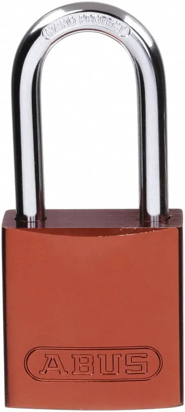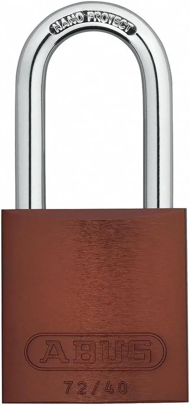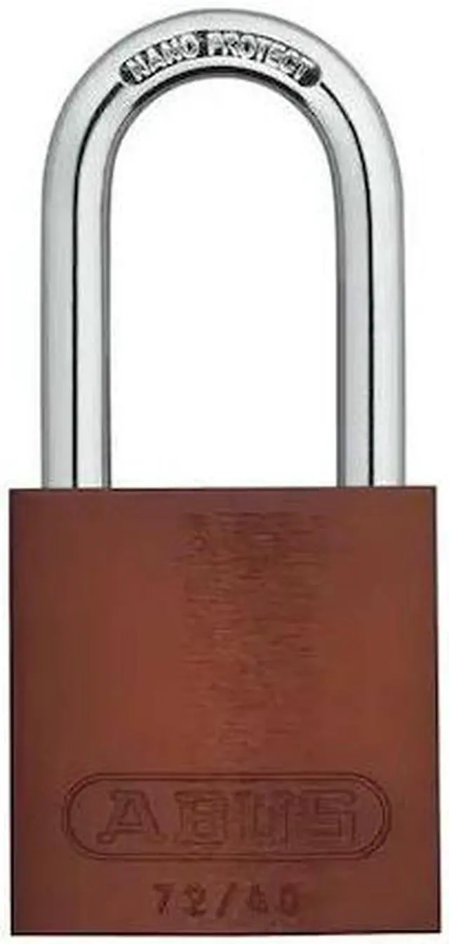 Lockout Padlock, Body Color Brown, Body Height 1 1/2 in, Body Material Aluminum, Body Thickness 11/16 in, Body Width 1 1/2 in, Header None/No Header, Horizontal Shackle Clearance 3/4 in, Key Type Keyed Different, Non-Removable Key Yes, Resistance Properties Corrosion Resistant, Heat Resistant, Shackle Diameter 1/4 in, Shackle Height 1 1/2 in, Shackle Material Hardened Steel, Shackle Type Open, Vertical Shackle Clearance 1 1/2 in, Width Across Shackle 13/16 in, Body Material Coating Anodized. This item has been restricted from sale in the following state (s): []