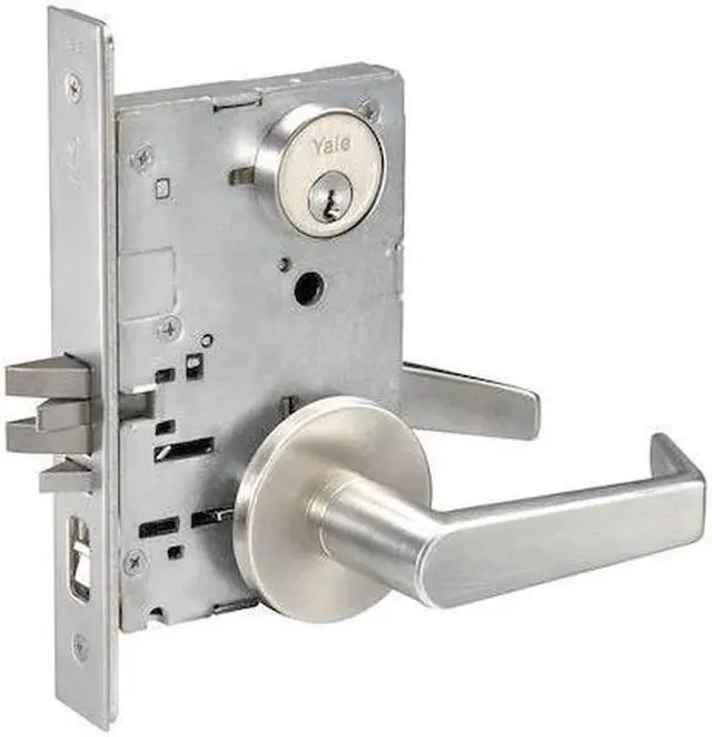California Proposition 65: This product contains a chemical known to the State of California to cause birth defects or other reproductive harm. Mortise Lockset w/Rose, HD, Commercial, Augusta (Right Angle) Style, Satin Chrome (626) Finish, Function Entrance/Office, Grade 1, Material Brass, Stainless Steel, Zinc, For Door Thickness 1 3/4 to 3 3/4 In., Backset 2 3/4 In., Front Size Dimension 8 x 1 1/4 In., Keying Different, Number of Keys 2, Pins 6, 1 1/4 x 4 7/8 Required Door Thickness 1 3/4, Cylinder, Deadbolt, Fire Rated 3 Hours, Accepts Standard Mortise Cylinders, For Use With Wood or Hollow Metal Doors, Includes Escutcheon Plate. This item has been restricted from sale in the following state (s): []