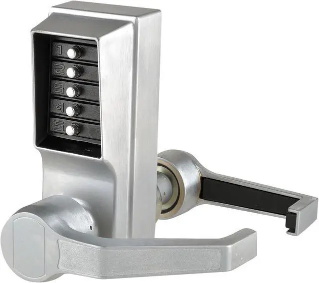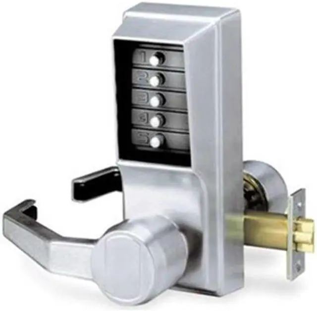 Mechanical Push Button Lockset, Handle Type Lever, Function Entry, Key Override Options None, Hand Right, Finish Satin Chrome, Door Thickness 1-3/8 in to 2-1/4 in, Keypad 5 Button, Vandal Resistant, Backset 2 3/4 in, ADA Compliant Yes, 3 hr Fire Rated, Case Material Zinc, Series L1000, Latch Length 1/2 in, Max. User Codes 1, Standards UL/cUL Listed, Weather Resistant Yes, Includes Access Key, Code Change Plug, Lock, Template, Mechanical. This item has been restricted from sale in the following state (s): []