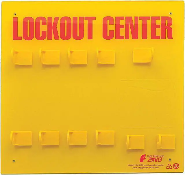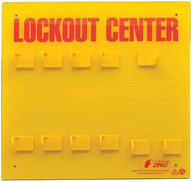 Lockout Board, Cable Lockouts Included Not Applicable, Cover Type Open Front, Electrical Lockouts Included Not Applicable, Filled No, Number of Hasps Included 0, Number of Lockouts Included 0, Number of Padlocks Included 0, Number of Tags Included 0, Visibility Inside Board Only, Language English, Background Color Yellow, Includes Lockout Tagout Board, Legend Lockout Center, Legend Type Text, Material Plastic, Mounting Location Wall, Number of Compartments 0, Number of Hooks 11. This item has been restricted from sale in the following state (s): []