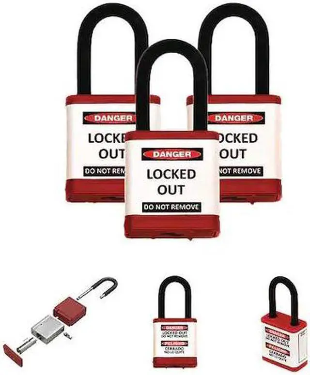 California Proposition 65: This product contains a chemical known to the State of California to cause birth defects or other reproductive harm. Lockout Padlock, Body Color Red, Body Height 3/4 in, Body Material Aluminum, Body Thickness 7/8 in, Body Width 1 1/2 in, Header Danger, Horizontal Shackle Clearance 3/4 in, Key Style Standard, Key Type Keyed Alike, Non-Removable Key Yes, Resistance Properties Corrosion Resistant, Shackle Diameter 1/4 in, Shackle Height 1 1/2 in, Shackle Material Hardened Steel, Shackle Type Open, Vertical Shackle Clearance 1 in, Width Across Shackle 3/4 in, Body Material Coating Plastic Encased