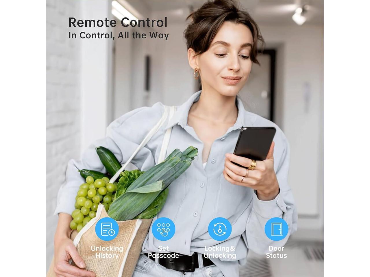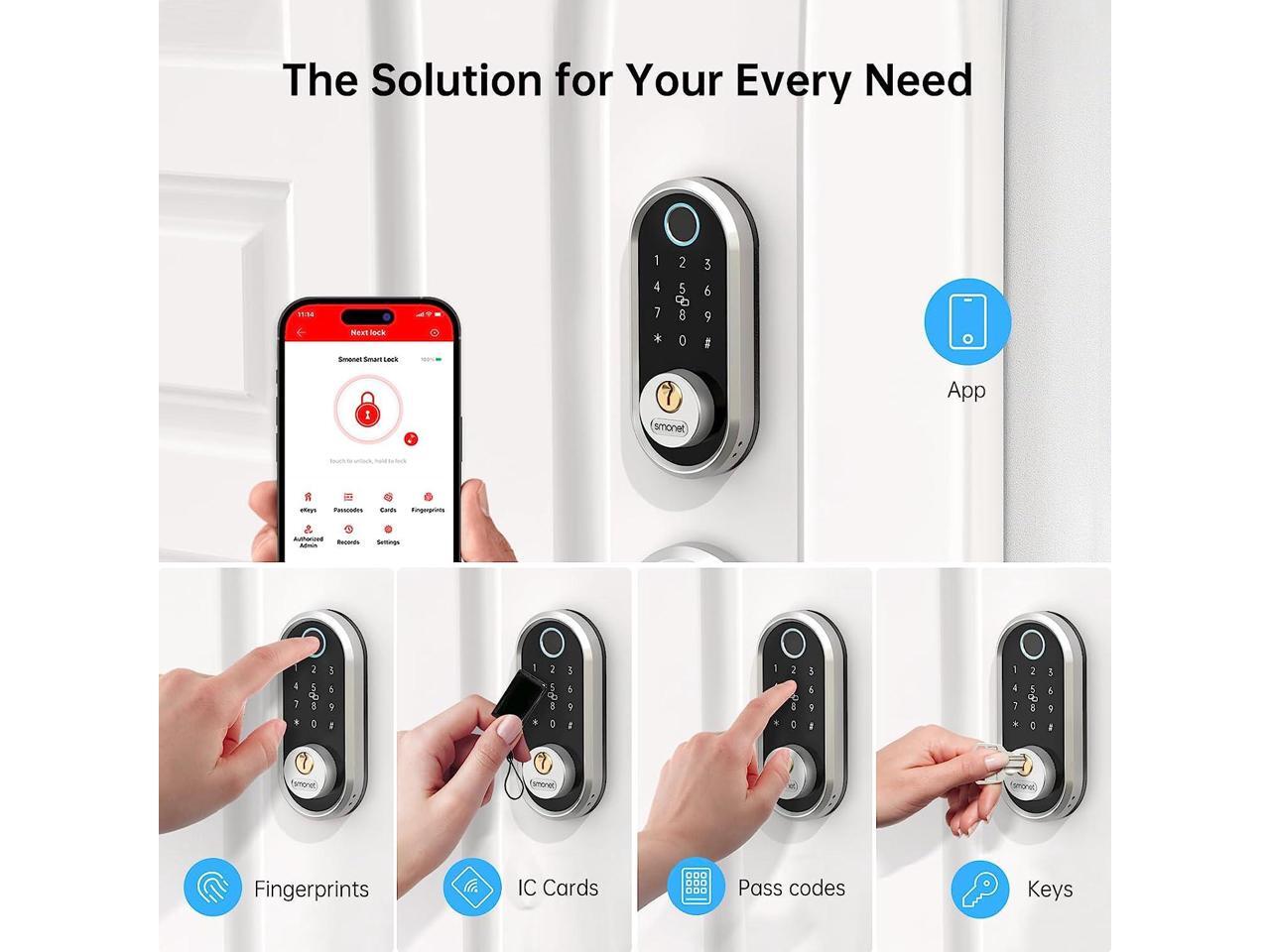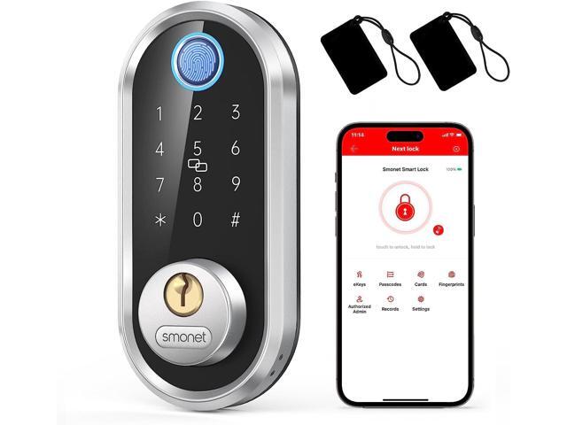 - Smart Bluetooth Keypad Lock - Not only bring you security and trust, but also bring you a brand-new smart home. Five ways to unlock your door - APP, Keypad, Fingerprint, IC Fob and Mechanical Keys. Paring with Smonet wifi gateway, device user could remotely control your smart door lock anywhere anytime, set up codes remotely and check real-time access log.