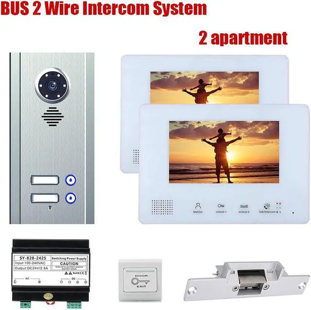 7inch TFT LCD Indoor Screen Monitor 2pin Wired Video Door Phone Visual Intercom Systems Doorbell Kit for Villa home 1 Units Apartment Door Bell + Elec NO Lock + Exit Switch, 1 doorbell + 2 monitor