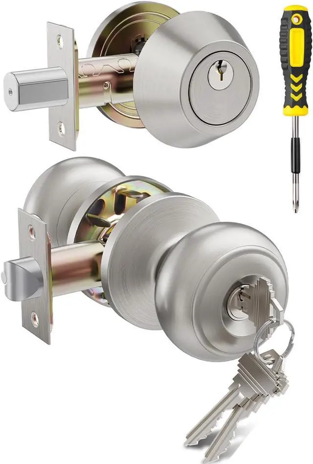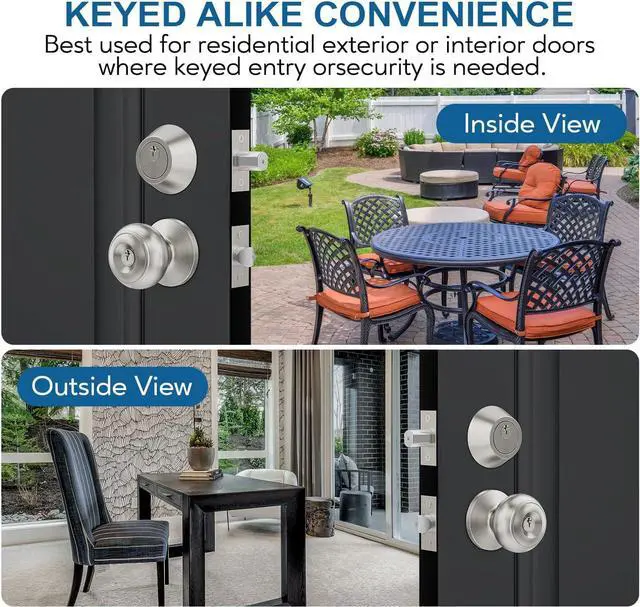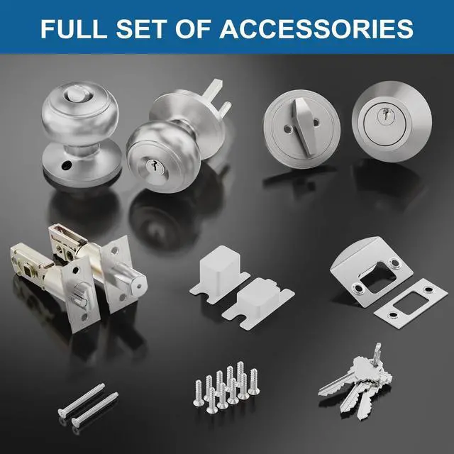 [PRODUCT FEATURES] All Keyed alike entry door knob and deadbolt set (all locks can be opened with one key), single cylinder deadbolt (keyed outside and turn button inside); Made from solid stainless steel; Door knobs set in Satin Nickel
