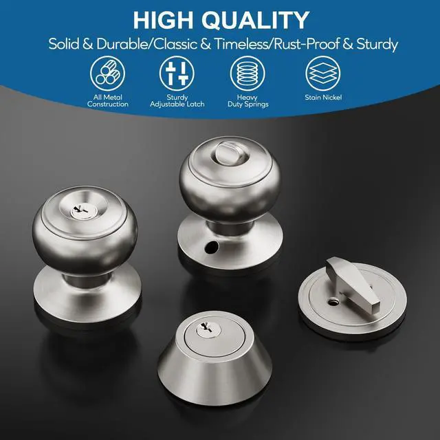 [Specifications]: Conformed with ANSI Grade 3 Security, Exceeds 200, 000 cycles. Satin nickel finish stainless steel knobs with high-grade copper lock and keys, high quality, durable, and resist corrosion.