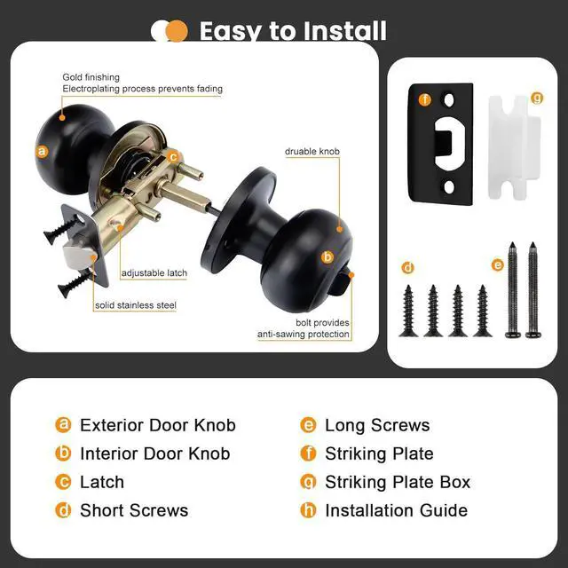 PACKAGE LIST - The door knob package includes 2 single door knobs, 1 strike plate, 1 latch, 1 installation guide and some screws. Many keyed-alike keys are included. Each of door knob is packaged separately to avoid scratches caused by collisions during transit
