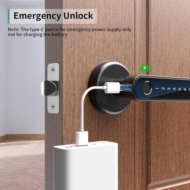 Long-Lasting Power: Powered by 4 AAA batteries (not included), fingerprint door knob features a low battery reminder and a Type-C interfacefor emergency charging, ensuring your lock is always ready