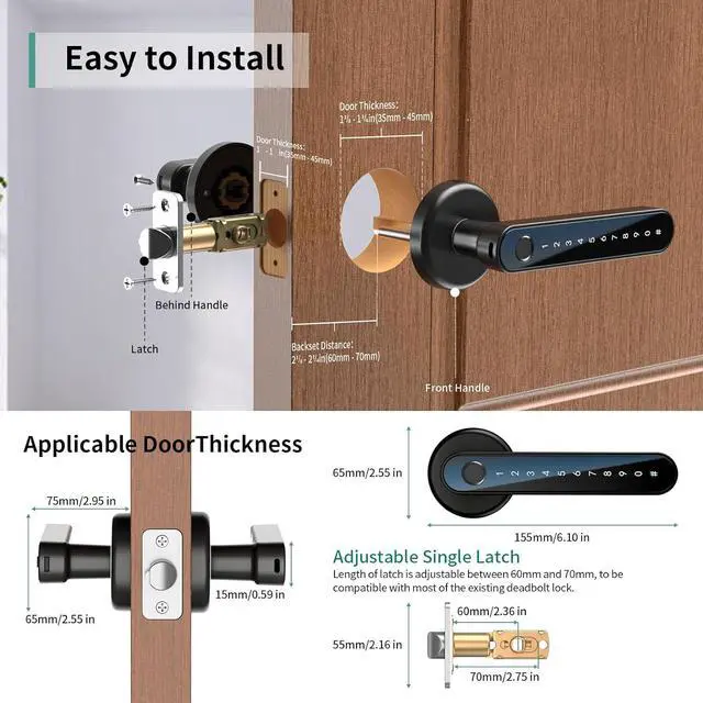 Strong Compatibility: Door lock with keypad designed for US standard doors, it fits backsets of 2-3/8 (60mm) and 2-1/8 (70mm) and door thicknesses from 1-3/8 to2-1/8 (35mm-55mm). No wiring or drilling required, and it fits both left-handed and right-handed doors