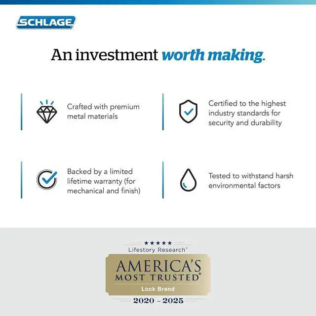 TRUSTED WARRANTY: Schlage locks are backed by a limited lifetime mechanical and finish warranty, and a 3-year electronics warranty; see Schlage warranty for full details