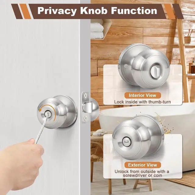Privacy Function: The brushed nickel door knob is ideal for bathrooms, bedrooms, and any room where privacy is needed. The privacy door knob hasnt keys, locks from the inside with a turn button and unlocks from the outside with a coin or screwdriver or other flat piece of metal in emergency