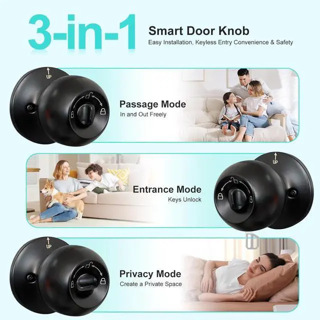 3 MODES FINGERPRINT DOOR KNOB - Easily switch modes by rotating your thumbprint around the smart door knob. The modes are passage mode, entrance mode, and privacy mode. Perfect bedroom door knobs with lock to keep unwanted guests from your privacy space.