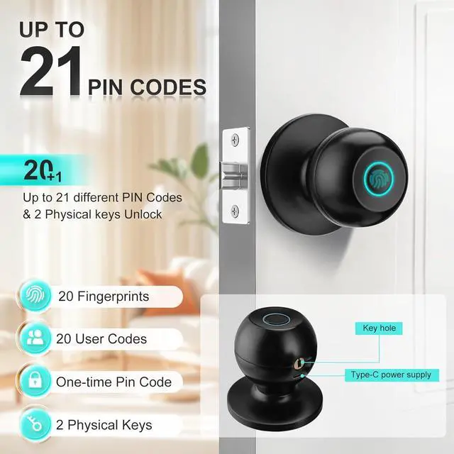 RECHARGEABLE & EASY INSTALLATION - fingerprint door lock has a built-in 400mAh rechargeable battery that takes 3 to 4 hours to charge fully with USB A-TypeC cable. The door lock is easy to install with a screwdriver and fits most US doors. Please refer to the installation instruction for detailed guide of this smart door knob.