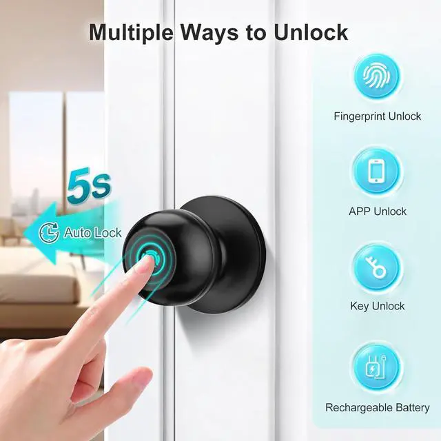 FINGERPRINT DOOR KNOB WITH APP - finger print door knobs come with an app to manage fingerprints, view unlocking records, lock/unlock and privacy mode to help create smarter door locks for bedrooms. App Control is only accessible within bluetooth range. WI-FI contorl require a separate purchase of gateway.
