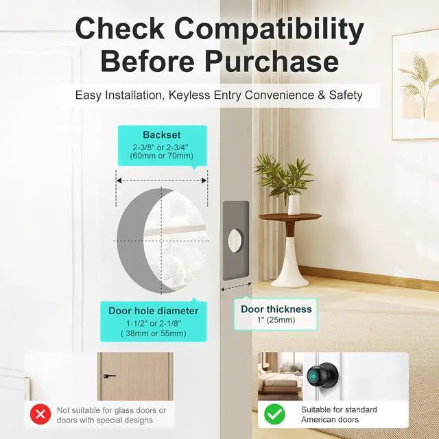 3-IN-1 SMART DOOR KNOB - The ultimate security smart door lock for your smart home or office. The fingerpritn door knob meets all your needs of the convenience of a smart door knob, the security of App control, and the reliability of traditional keys. Great fingerprint door lock for bedroom, living room, apartment