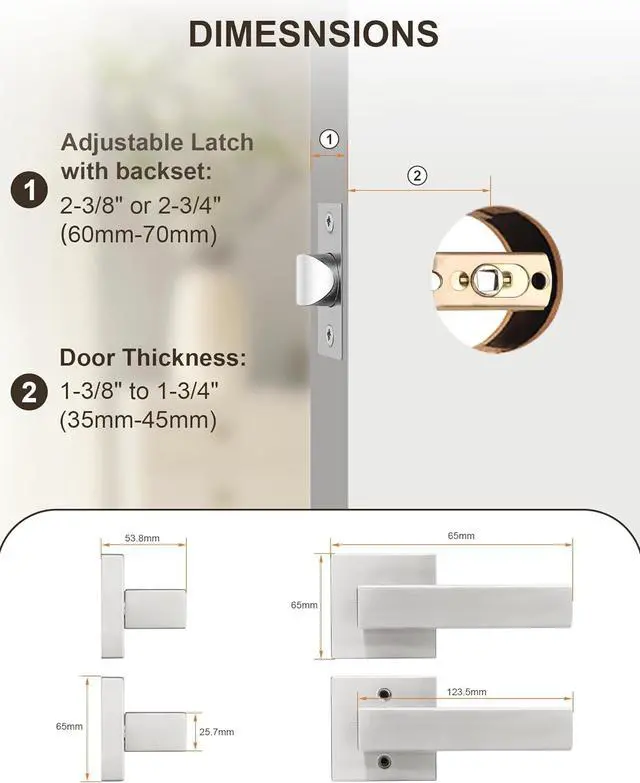 SIZE: Adjustable Latch with 2-3/8" to 2-3/4" (60 or 70mm) backset. Fit all doors 1-3/8" to 1-3/4" (35mm to 45mm) thick;