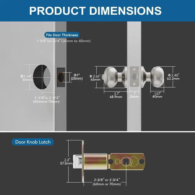 Measurements: Adjustable latch with backset is 2-3/8" or 2-3/4" (60mm or 70mm) to fit most standard doors in the thickness of 1-3/8" to 1-3/4" (35mm to 45mm). The maximum door thickness is 1-3/4"