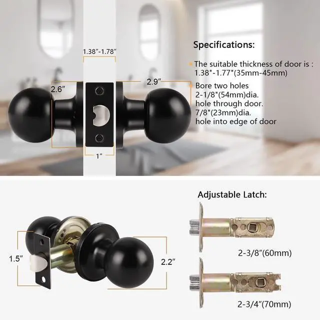 [Product Dimension] The solid latch length, measured from the center of the hole to the edge of the door, is 2-3/8 inches or 2-3/4 inches (60mm or 70mm). The dimension of door board thicknesses is between 1-3/4 inches to 1-3/8 inches (35mm to 45mm)