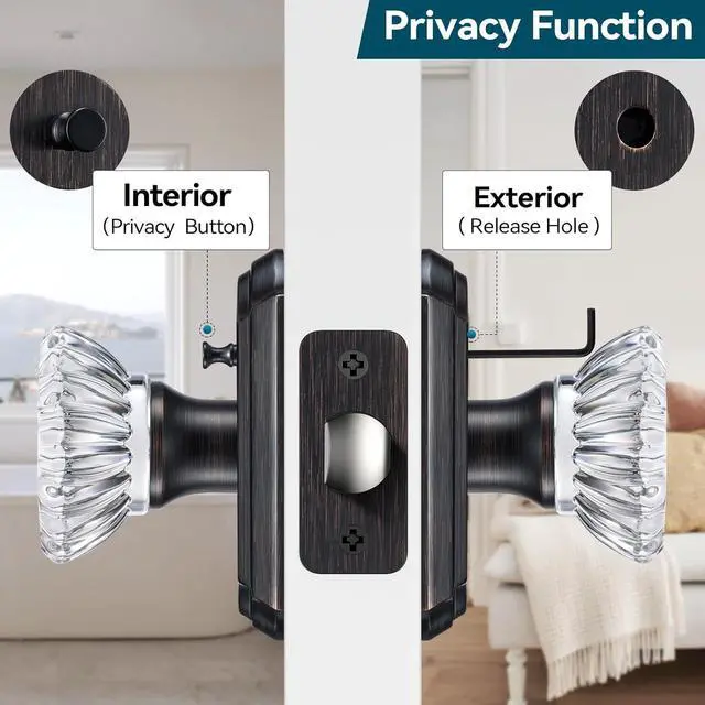 Privacy Function The antique crystal door knobs with lock are ideal for interior room where privacy is needed, such as bedroom and bathroom. From interior, push pin button to lock, twist crystal knob to unlock. And you can use a hex key and any thin tool to insert the release hole to open the door from outside in emergency.