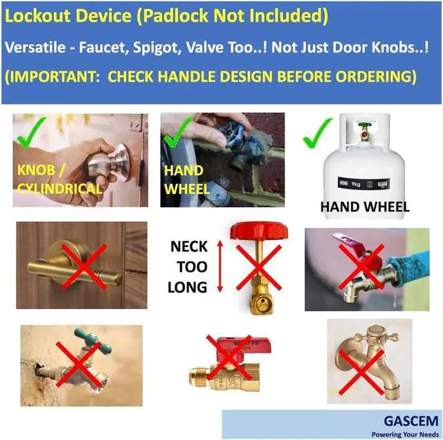 Gascem Lockout Device is ONLY for handle design of CYLINDRICAL KNOB AND HANDWHEEL (BUT NOT LEVER OR CROSS). And, also for handles of suitable dimension. PLEASE CHECK YOUR HANDLES DESIGN & DIMENSION AGAINST THOSE IN THE PHOTOS ON THE LEFT OR DESCRIPTION BELOW BEFORE ORDERING.
