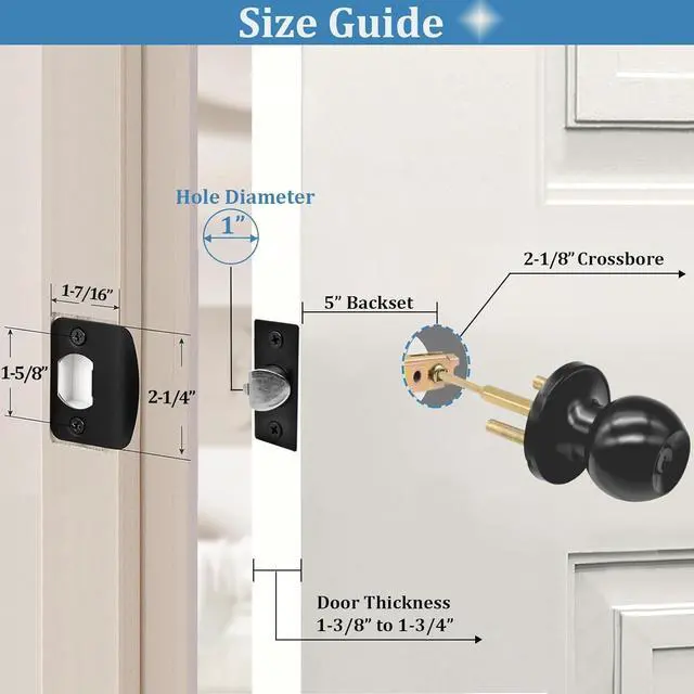 Fits standard door thickness: 1-3/8" to 1-3/4" (35mm- 45mm); Package includes interior and exterior ball door knob×1, 5" backset entry door latch×1, brass keys×3, door lock strike plate×1, instructions×1 and necessary accessories. Replacement is very simple, install your knob set in a flash by yourself.