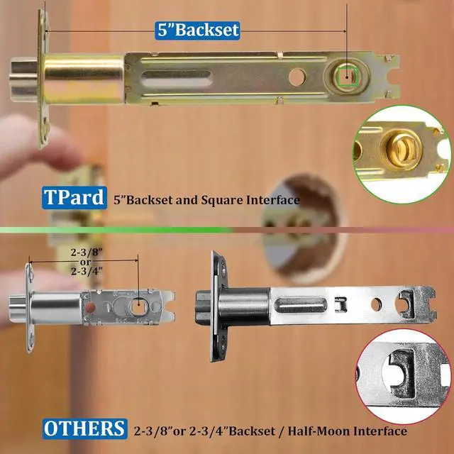 5 Inch Backset Entry Door Knobs Set: When your old mid-century door knob is old or damaged, it' s time to replace it with TPard' s premium extended 5-in backset latch entrance door knobset hardware, which can even update your old style doors with modern style knobs, providing a reliable and efficient door hardware solution for your vintage entry doors.