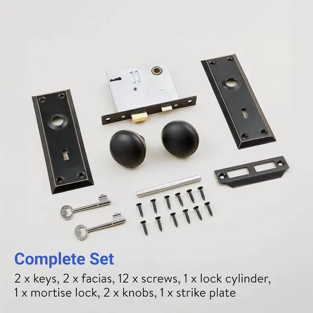 All-in-One Old Door Knob Replacement: Our mortise lock set interior door installation set has a lock cylinder, mortise lock, strike plate, 2 keys, 2 facias, and 12 screws for easy antique door hardware installation.