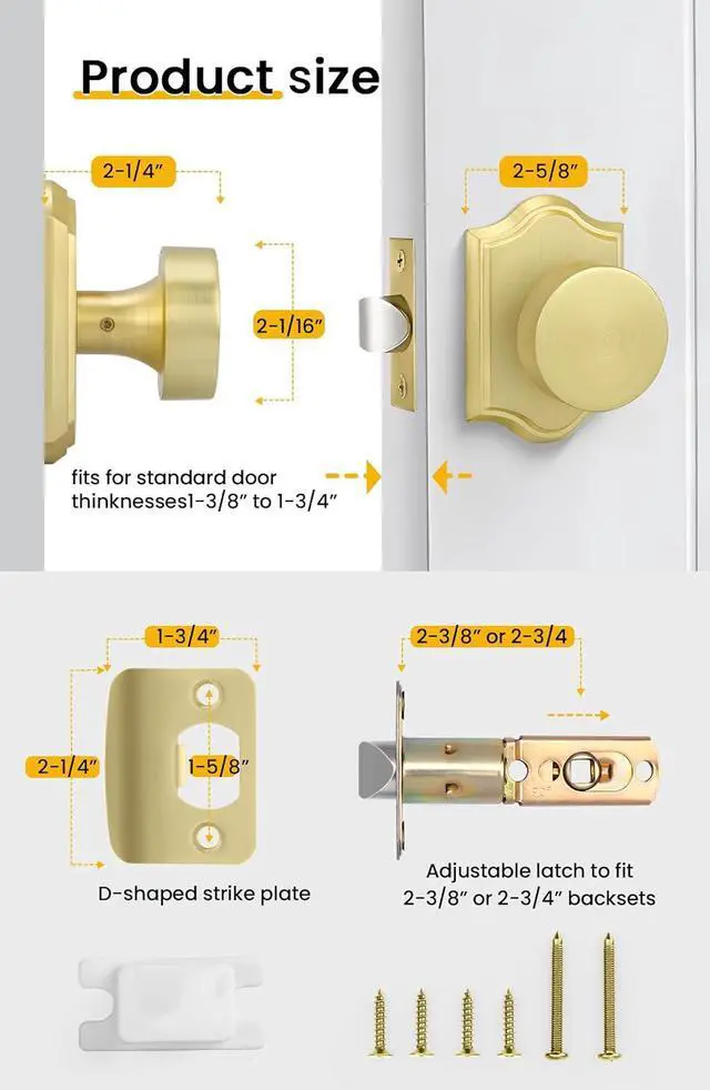 Everything You Need in One Set Each package includes the gold closet door knob, latch, strike plate, mounting screws, and detailed instructions. Compatible with 1-3/8" to 1-3/4" thick doors and adjustable backsets (2-3/8" or 2-3/4" ). Great as a hallway door knob or closet door knob.