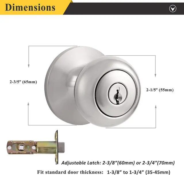 Features an adjustable latch 2-3/8" or 2-3/4" (60mm or 70mm) to fit all standard doors 1-3/8 ' ' to 1-3/4 ' ' (35mm-45mm) thick.