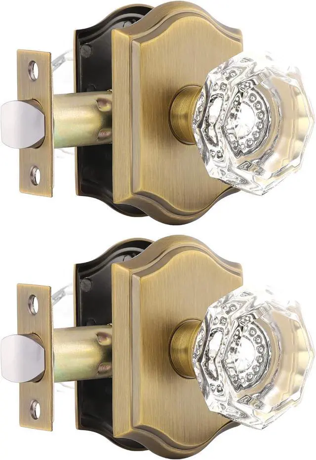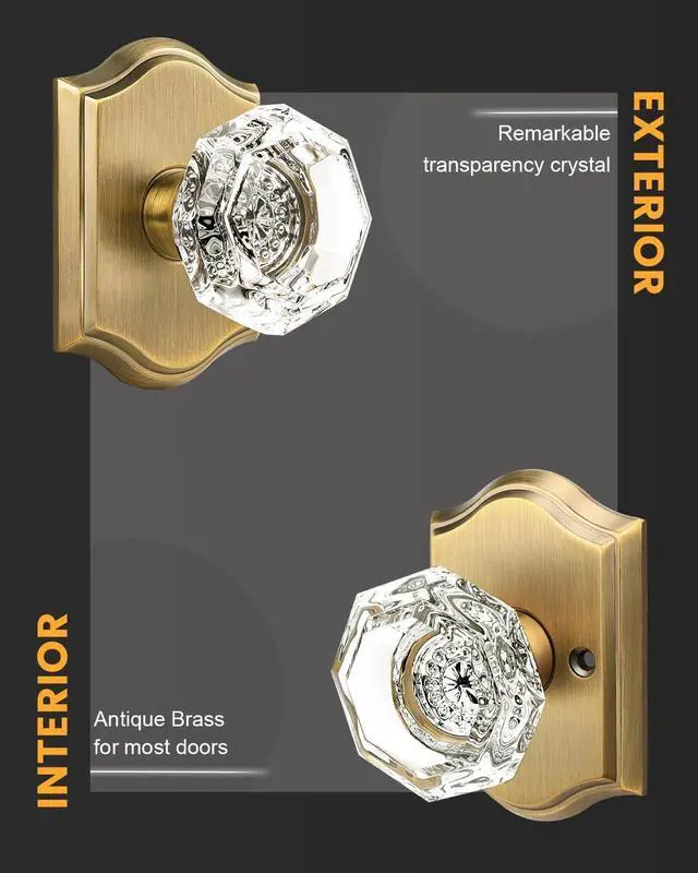 Crystal Doorknob FeaturesThe Diamond crystal knob is octagonal clear glass shape, with zinc alloy rosette and plate, antique brass finish, the door knob set is heavy duty and durable for last using