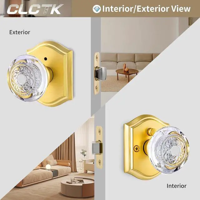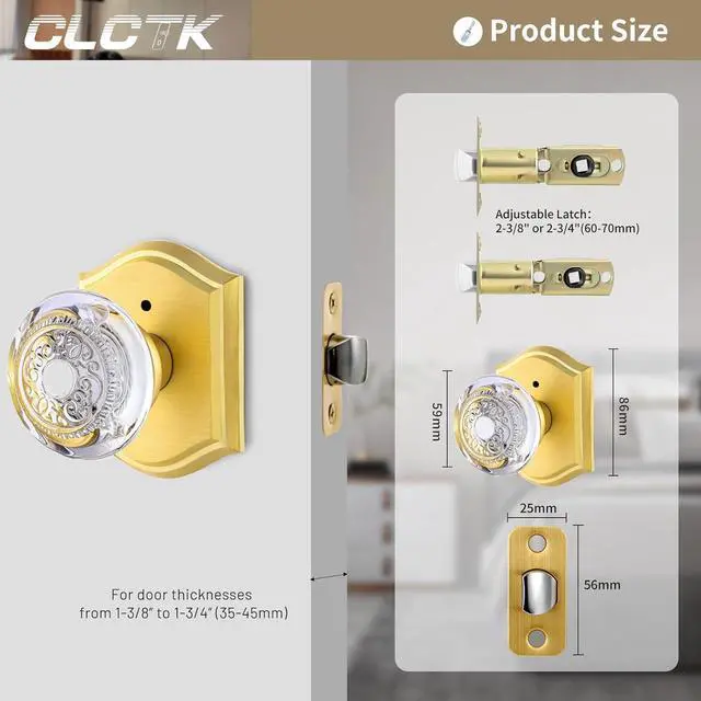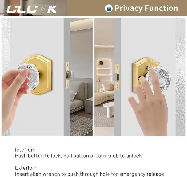 Privacy FunctionThe crystal door knobs can be locked using the thumb button function from inside, and be unlocked from the outside with Allen key in emergency.