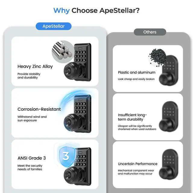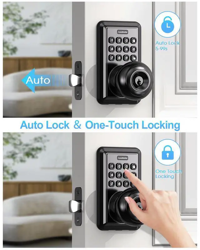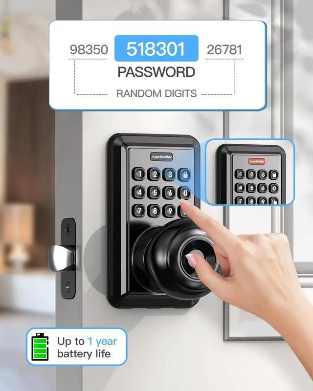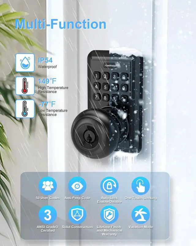 With IP54 weatherproofing, this keyless entry door lock with knob is designed to endure temperatures from -77°F to 149°F, performing reliably in all weather conditions, including rain, sunshine, frost, snow, or hail.