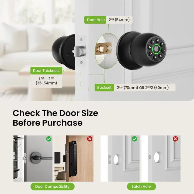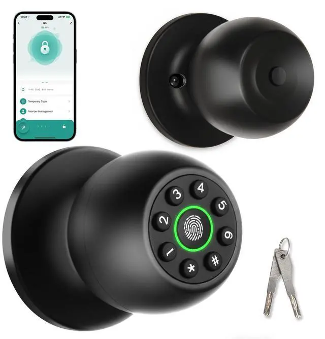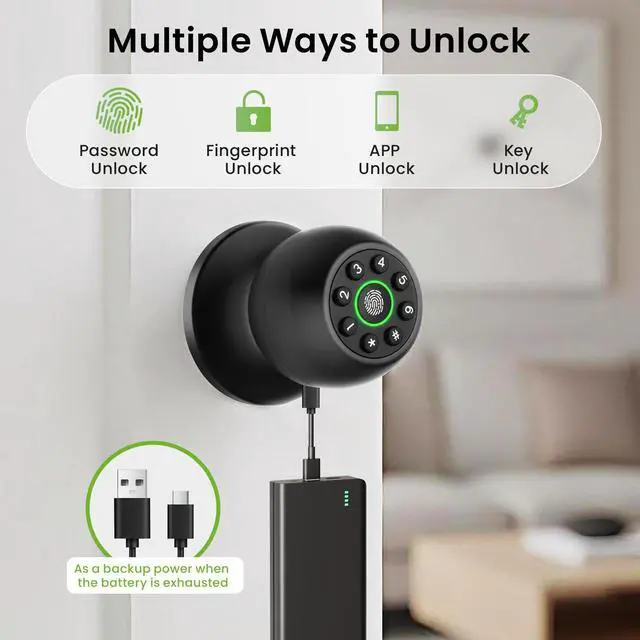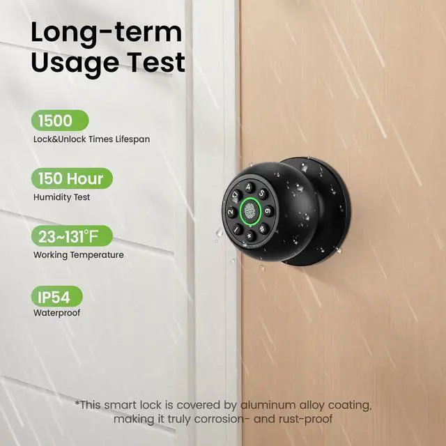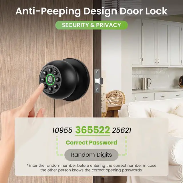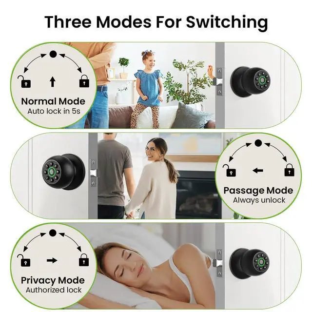 4-in-1 Smart Door Knob: Our smart door lock adopts up to 4 unlocking methods which provides a convenient way for locking and unlocking the door. Fingerprint recognition (supporting 50 users), personalized password (supporting 50 users), APP control, and backup keys. Equipped with anti peer keyboard functions to enhance security. Easily switch between automatic locking, access mode, and privacy mode to improve usability