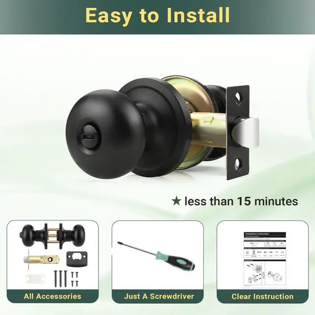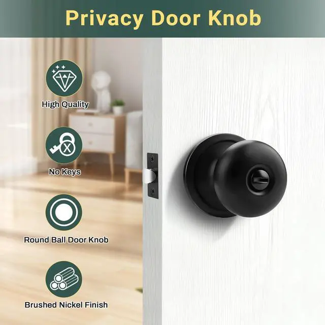 Privacy Door Knob with Lock, Keyless Door Knob Interior for Bedroom and Bathroom, Easy Install Quiet Round Knob for Standard Doors, Matte Black, 2 Pack