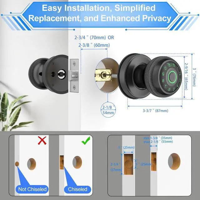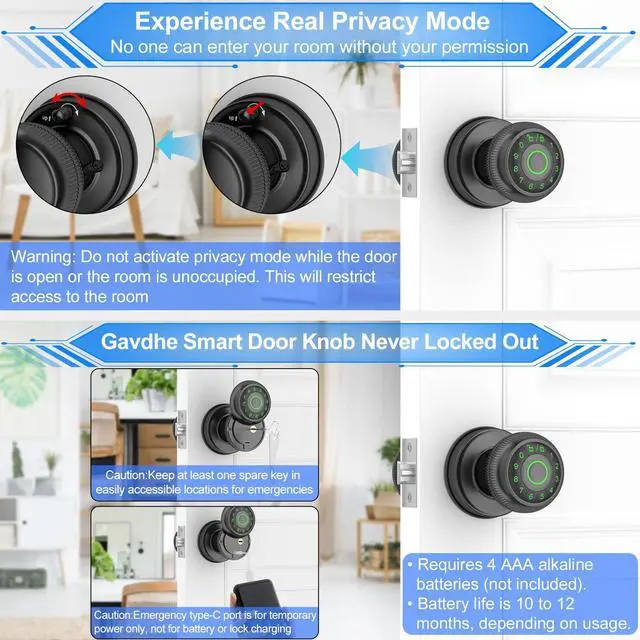 • Easy Installation with No Lockout Worries: This keyless entry door knob installs effortlessly on standard U.S. doors, featuring an adjustable deadlatch (2-3/8" [60mm] or 2-1/8" [70mm]) and accommodating door thicknesses from 1-3/8" [35mm] to 2-1/8" [55mm]. It boasts a 10-12 month battery life with 4 AAA alkaline batteries (not included), plus backup keys and an emergency Type-C port for temporary unlocking.