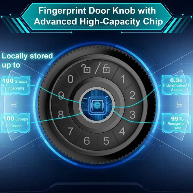 • Versatile Access Solutions: This biometric door knob utilizes an advanced chip to store up to 100 fingerprints and 100 access codes locally, ensuring no privacy leakage. With its larger capacity, its perfect for families or shared spaces, featuring fast 0.3-second fingerprint recognition with a 98% accuracy rate for swift and hassle-free access.