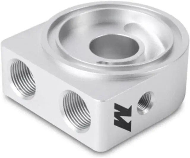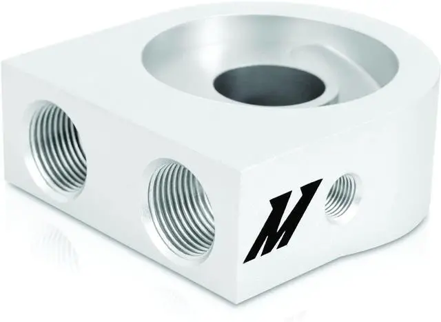 This Mishimoto Oil Sandwich Plate is a lightweight, high-flow sandwich plate that's used to regulate oil flow to the cooler until the engine is properly warmed up and allows for oil system protection in cold climates. This Oil Sandwich Plate is designed specifically for M20 or 3/4"-16UNF Stainless Steel Center Bolts and has two 1/8" NPT plugged ports for optional sensors or gauges.