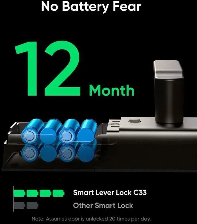 3. No Battery Worries with 12-Month Power: Enjoy peace of mind with the eufy Smart Lever Lock C33, providing reliable security without the constant need for battery changes. The lock remains operational throughout the year, ensuring continuous protection.