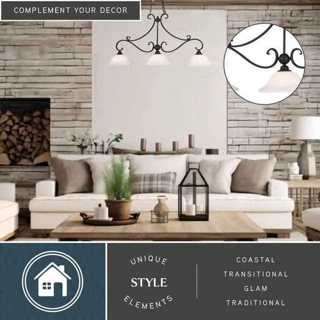 Transitional decor is a combination of traditional and contemporary design that uses materials and finishes equaling classic, timeless design. The Monrovia collection of pendant lights takes that concept and modernizes it for today's on-trend spaces including farmhouse, vintage, antique, and traditional decor. The scrolled arms and large, open glass shades are the focal point of this design. Available in multiple finishes, this hanging ceiling light is ideal for kitchen island lighting, pool table light fixtures, and linear dining room tables.