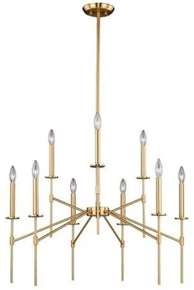 Sculptural elegance is informed by simplicity of line in this mid-century modern collection. The Kedzie makes a distinctive historical reference with a playful touch in its formal symmetry. The Kedzie full living collection, including a nine light chandelier and two light wall sconces, each feature a natural brass finish to compliment any room and design motif. Allow yourself to be a trend setter with this distinctive look. Ideal for kitchens, dining areas, and foyers.