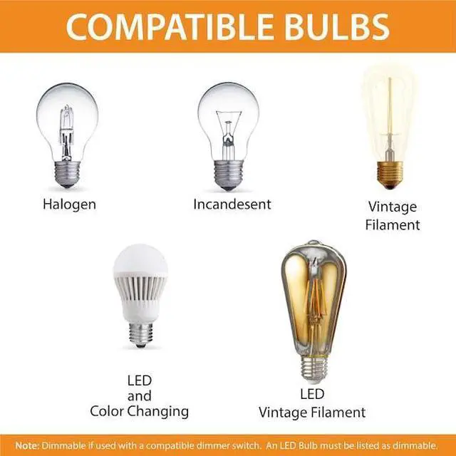 - Dimmable for desired illumination levels when used with dimmable bulbs and compatible wall switch