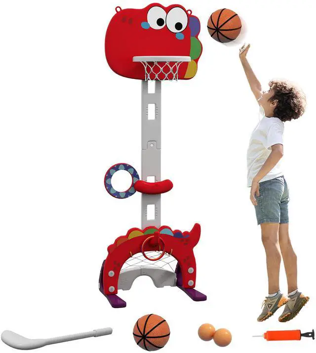 Developing Baby Skills: This dinosaur-themed toddler basketball hoop, through fun activities, not only enhances your child's coordination and physical strength but also develops social skills through interactive play.