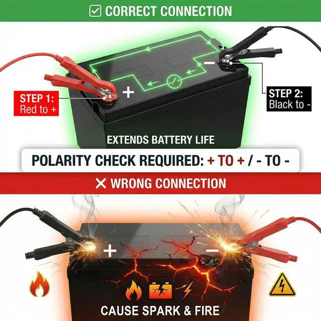 Important Notice Designed exclusively for 12V (12.8V) LiFePO4 batteries. Not compatible with lead-acid batteries. Ensure the power is disconnected before connecting or disconnecting the charger to the battery. Match the chargers positive and negative terminals correctly with the battery (Red for Positive +, Black for Negative -).