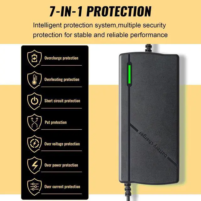LED Indicator & Robust Construction Equipped with an LED indicator for easy monitoring of the charging process, and housed in a durable casing with a cooling fan that doubles as an overheat protection heat sink.