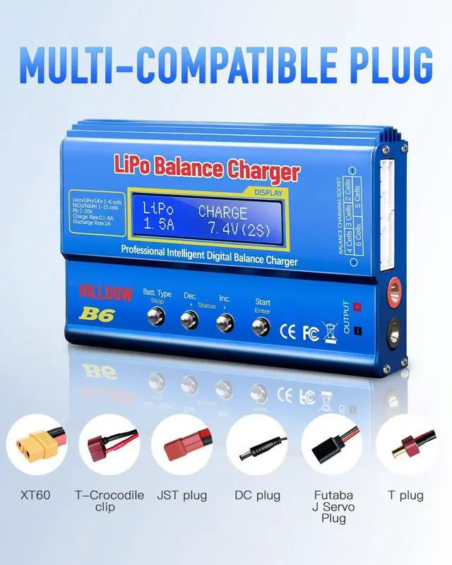 A: It comes with DC plug,XT60,JST plug,Futaba J Servo Plug and T plug.